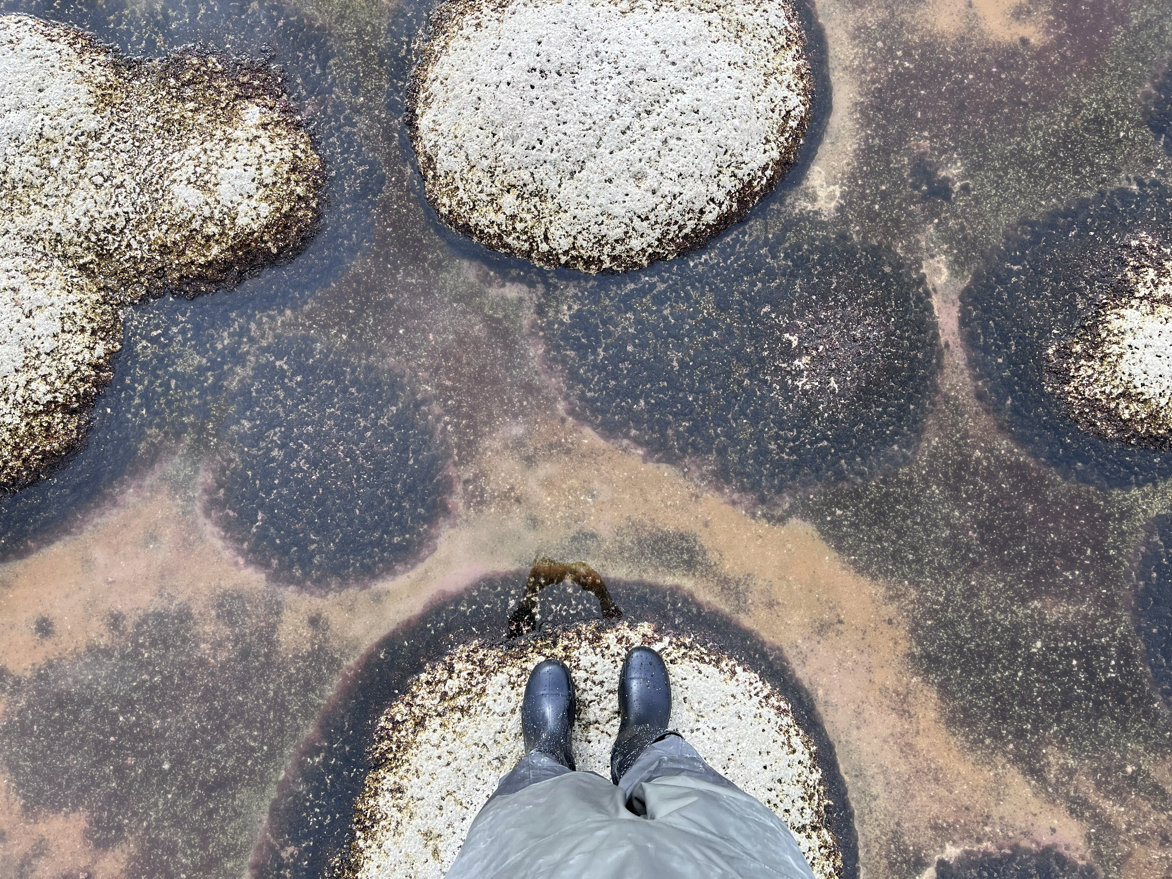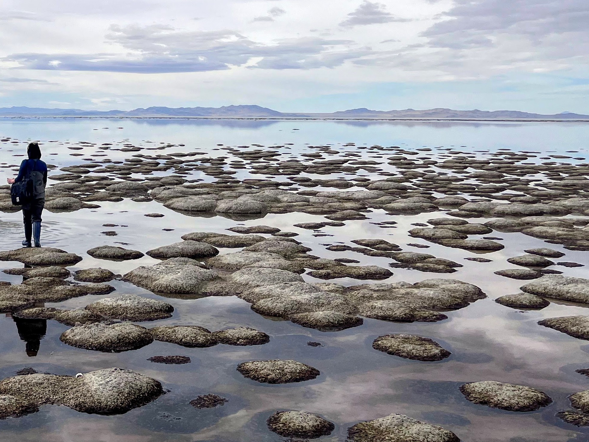 Partially submerged microbialites, Great Salt Lake, Utah. Below water, the mounds support green microbial mats. The desiccated tops of the mounds turn white.